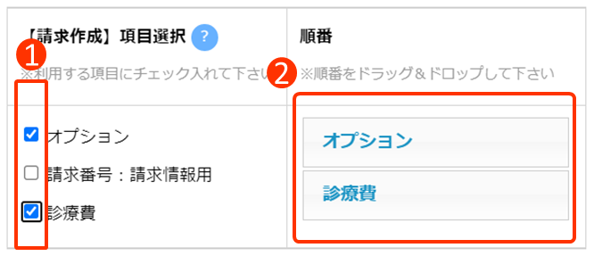 ①[【請求作成]項目選択]で請求作成時に追加したい項目をチェック