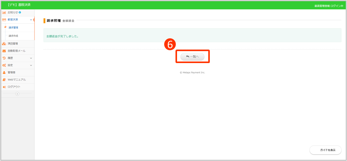 決済状況が[決済完了]の請求金額を返金することが可能です。
