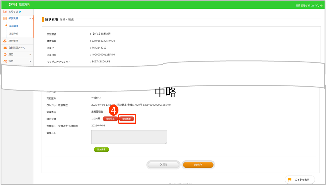 ※金額返金の履歴は、[請求一覧 - 詳細]のクレジット取引履歴に記載されます