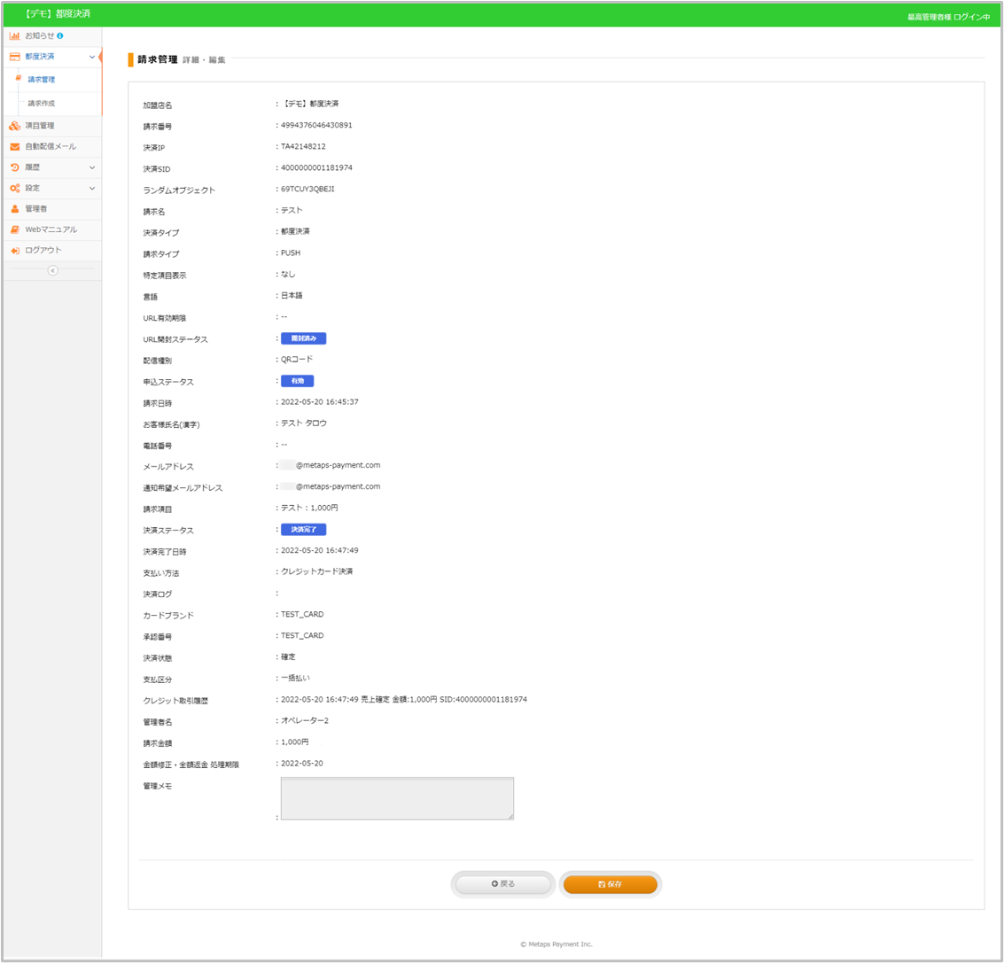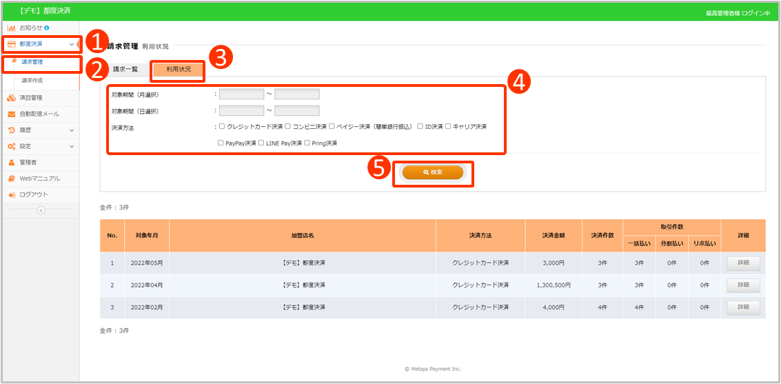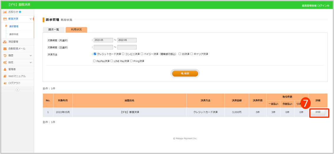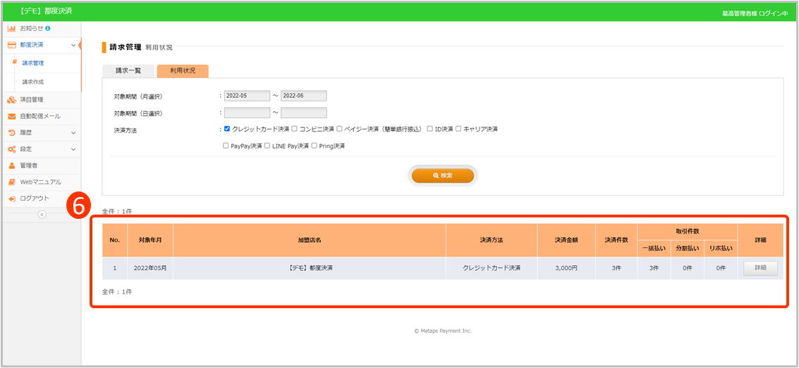 | 詳細 | 対象年月の対象決済方法の詳細が確認できます。 |