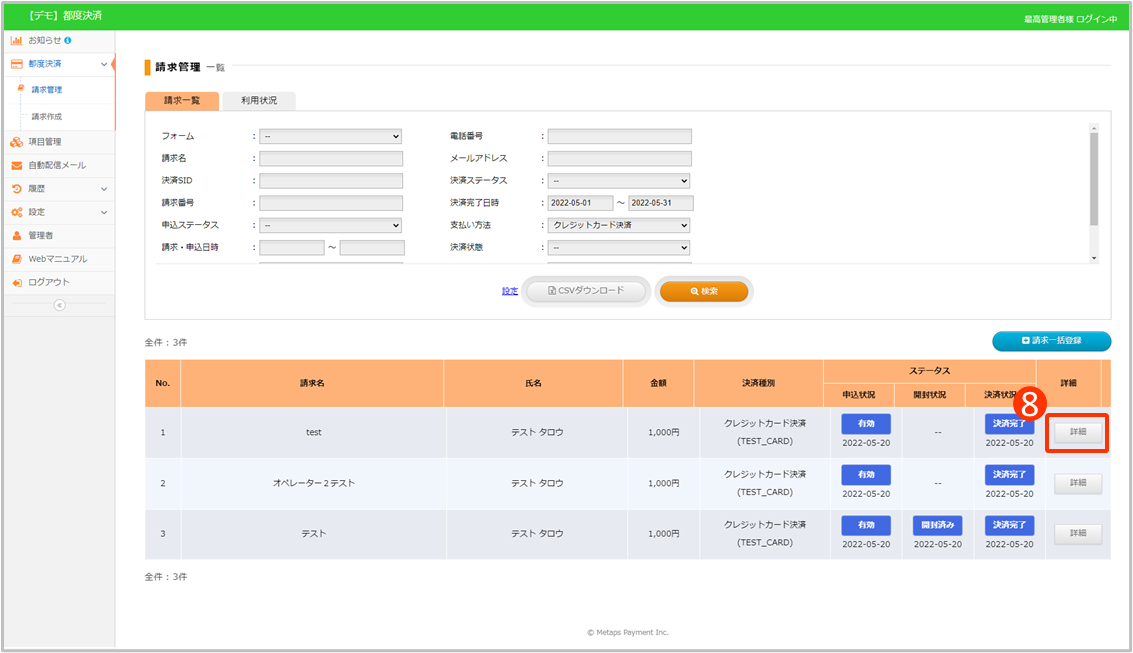 ⑧「④」で指定した対象期間、決済種別の請求一覧画面が表示