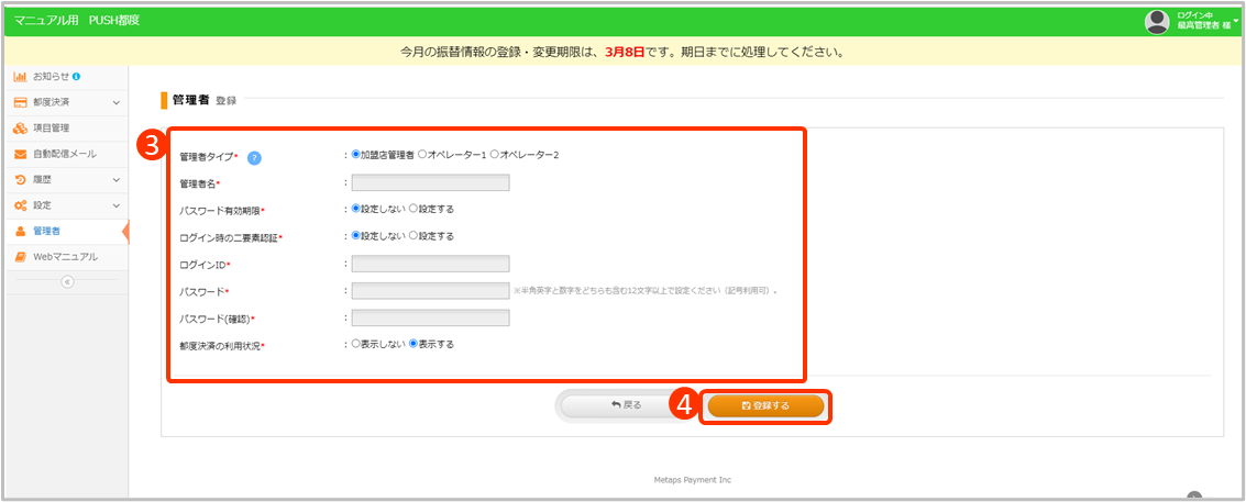 | 管理者タイプ | タイプの設定 タイプごとに利用できない機能があります。 加盟店管理者…すべての操作ができます。 オペレーター1…項目管理など一部機能が利用できません。 オペレーター2…[オペレーター1]の機能制限に加え金額修正や会員削除等ができません。 管理者タイプ別機能制限の一覧はこちら |