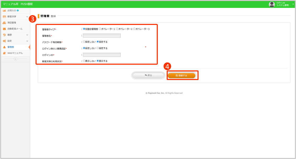 タイプの設定 タイプごとに利用できない機能があります。 加盟店管理者…すべての操作ができます。 オペレーター1…項目管理など一部機能が利用できません。 オペレーター2…[オペレーター1]の機能制限に加え金額修正や会員削除等ができません。 管理者タイプ別機能制限の一覧はこちら |