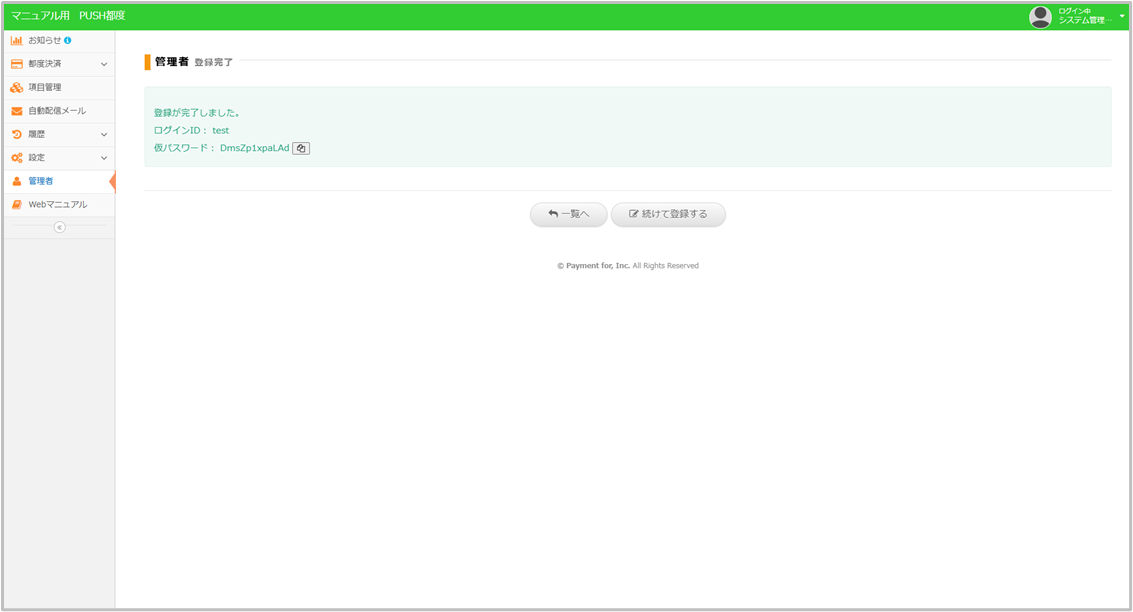⑤初回ログイン用の仮パスワードが表示されます。