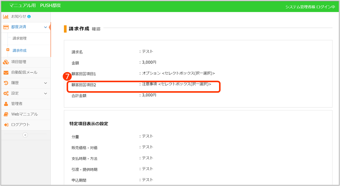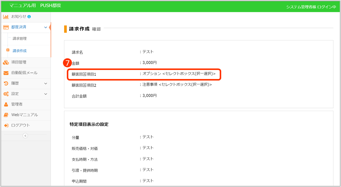 ⑦作成した項目が請求内容に追加され、合計金額に反映されます。(項目は例です)