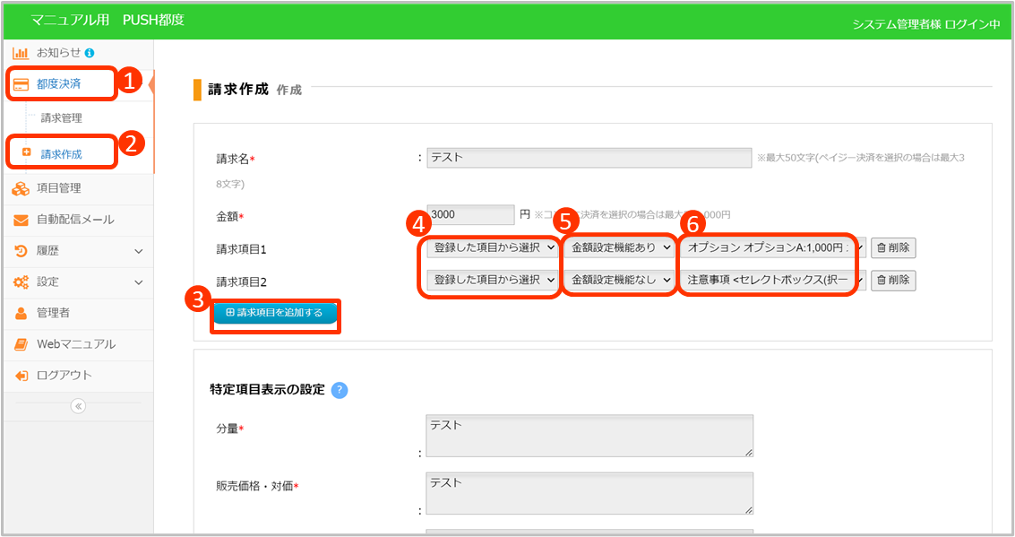 ⑦作成した項目が請求内容に追加されます。(項目は例です)
