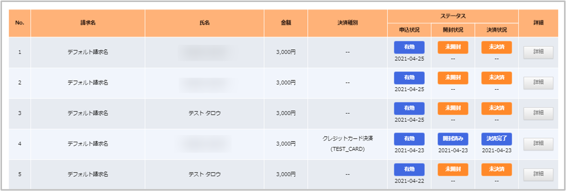 | 詳細 | 決済の詳細を確認できます。 |