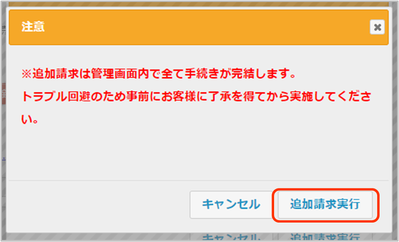※クリック後注意文が表示されるのでご確認いただき再度[追加請求実行]をクリック